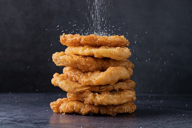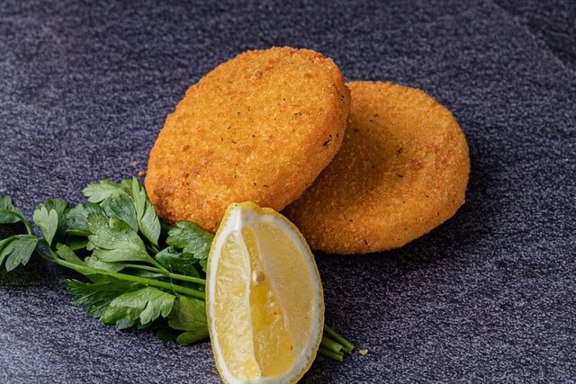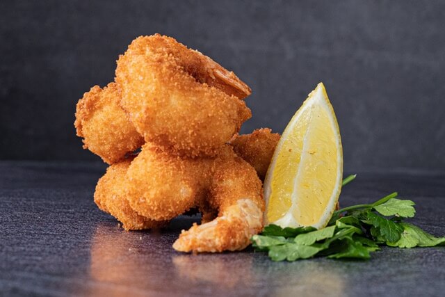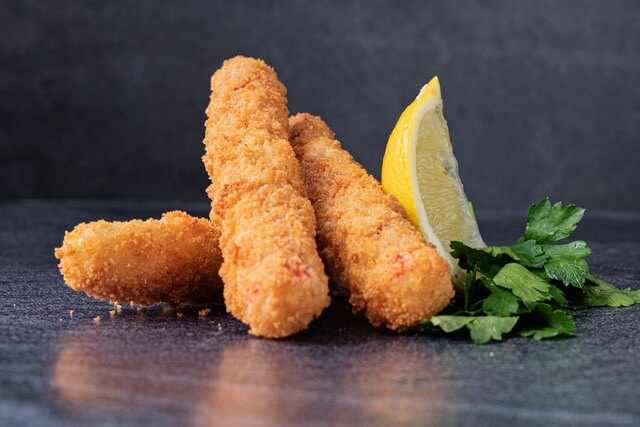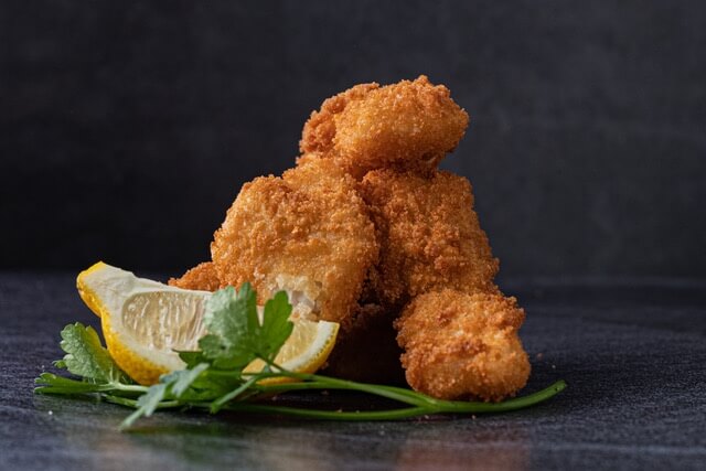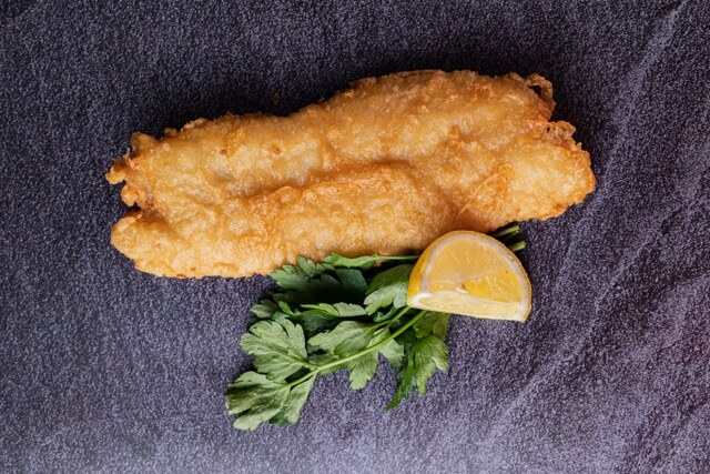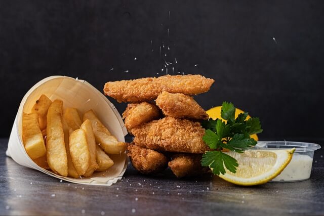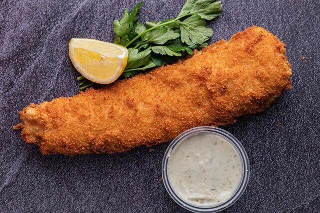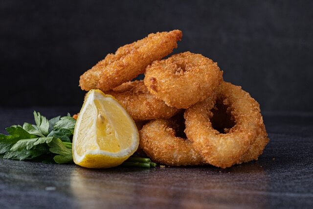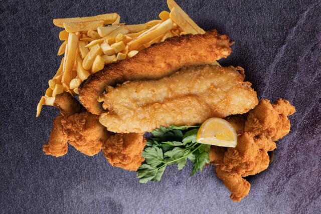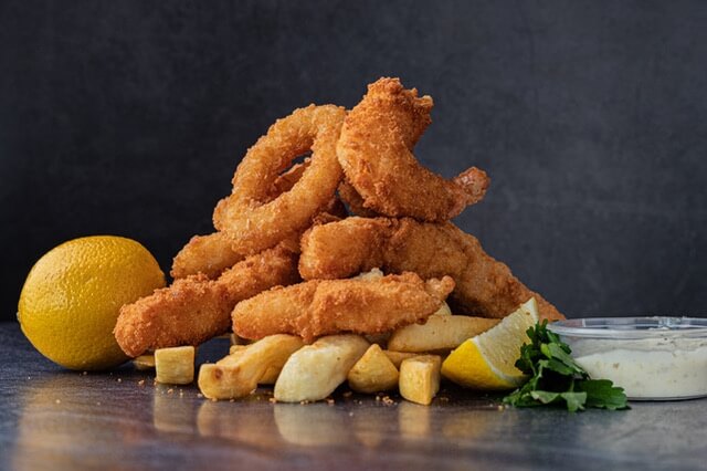 2x Seafood sticks, 3x fish bites, 4x calamari rings, 1x prawn cutlet with chips, lemon & tartare