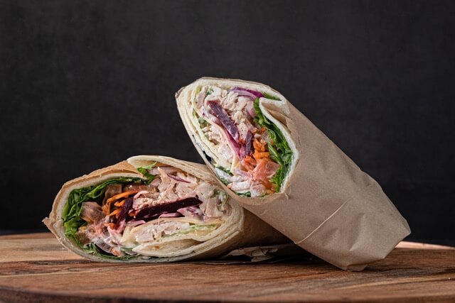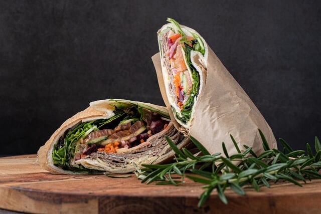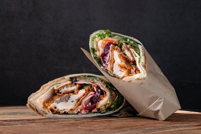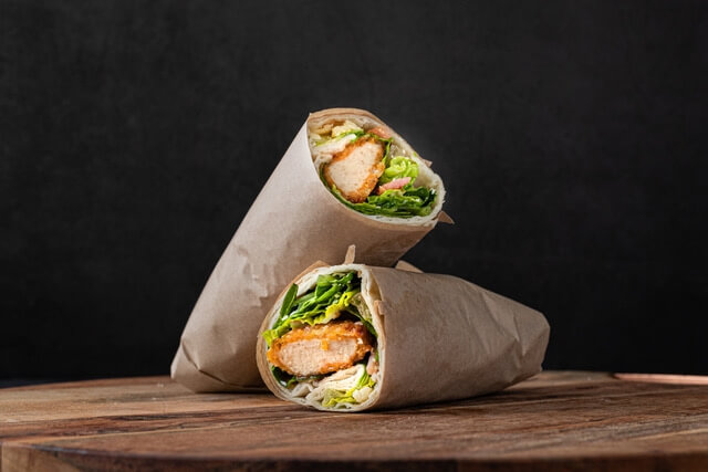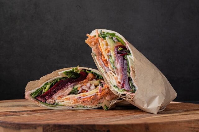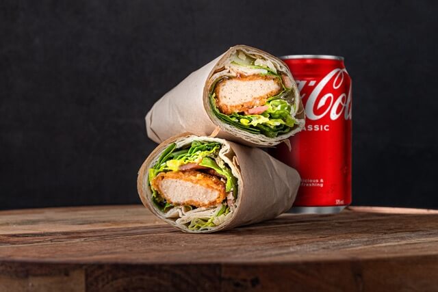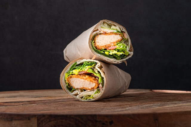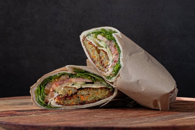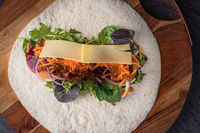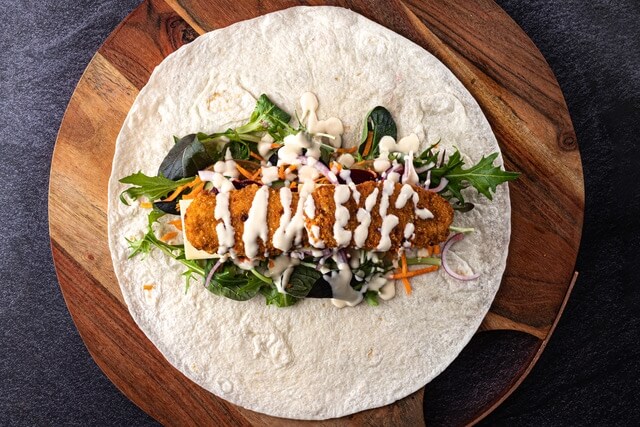 Our own veggie pattie with iceberg lettuce tomato cucumber cheese sweet chilli sauce & sour cream on a white tortilla wrap