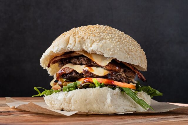 Two beef patties, bacon, tomato, lettuce, cheese & sauce