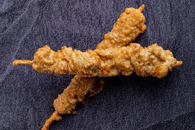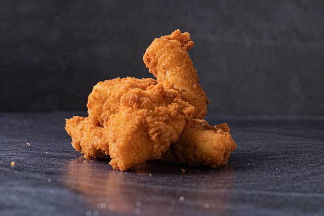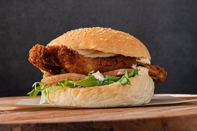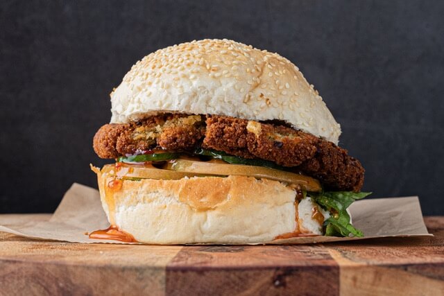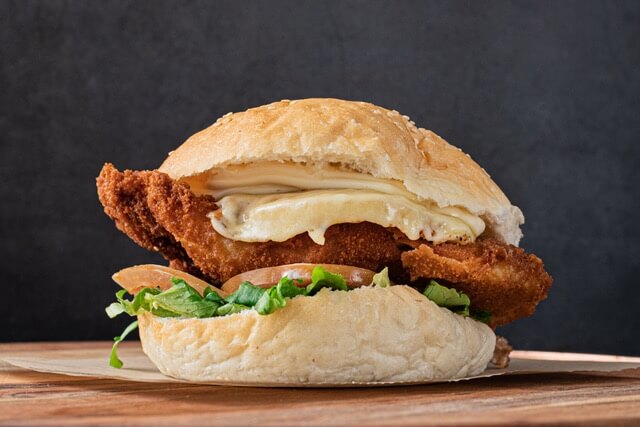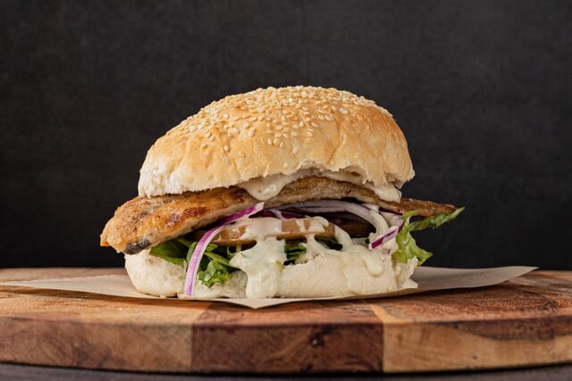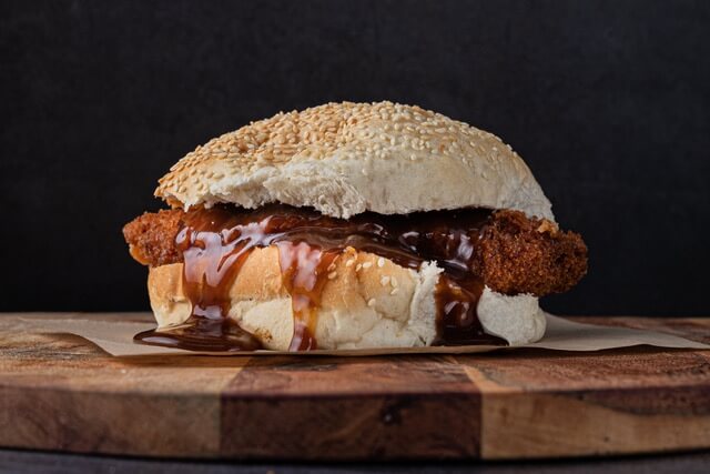 Freshly crumbed chicken breast covered in gravy on a seeded round roll