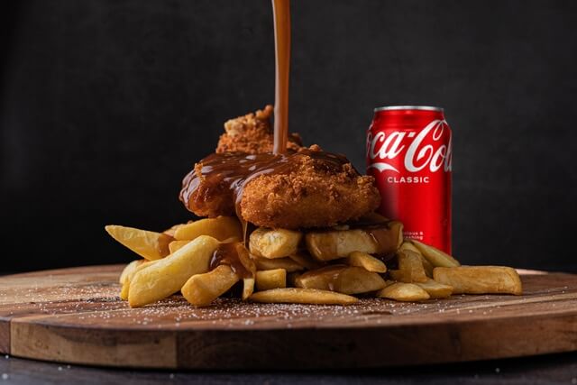 Chicken Schnitzel, Chips & gravy with a 375ml can of drink