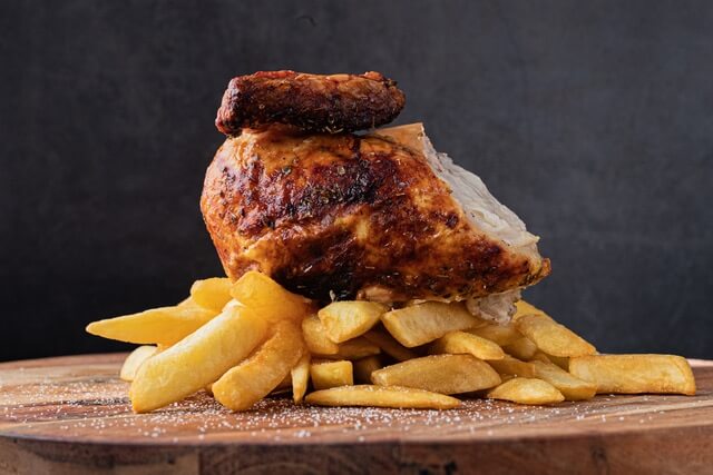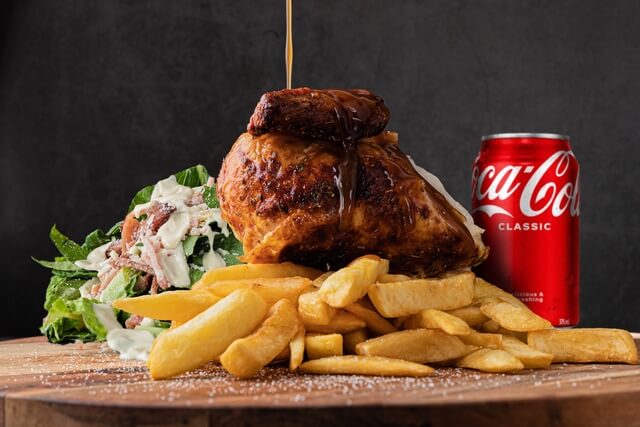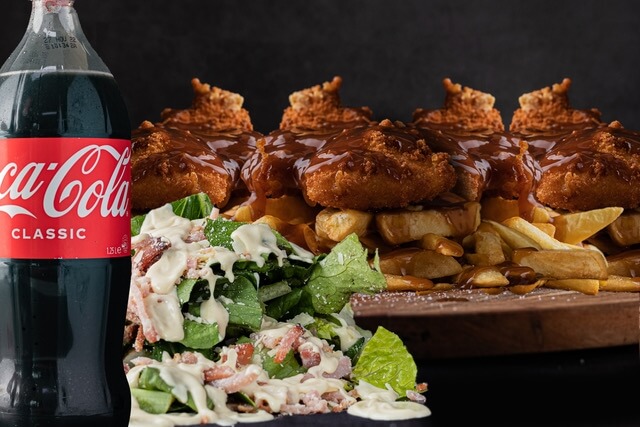 4 Chicken schnitzels, large chips, large salad, large gravy and a 1.25L bottle of drink