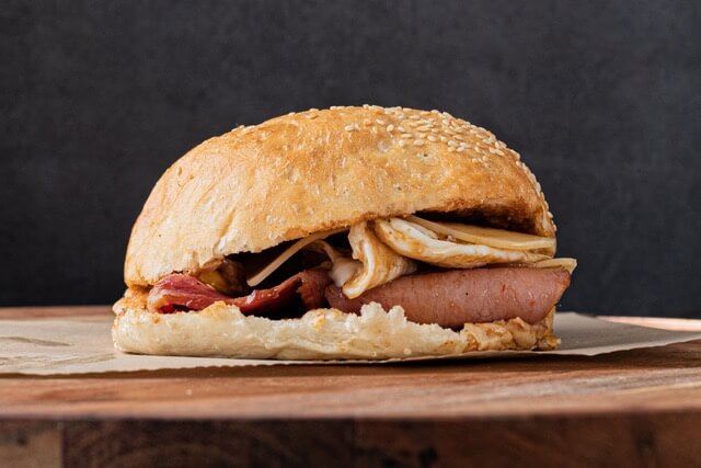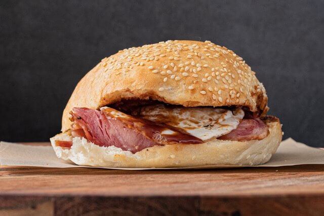 Beef patty, lettuce, tomato, beetroot, onion, egg, bacon, cheese, pineapple & sauce