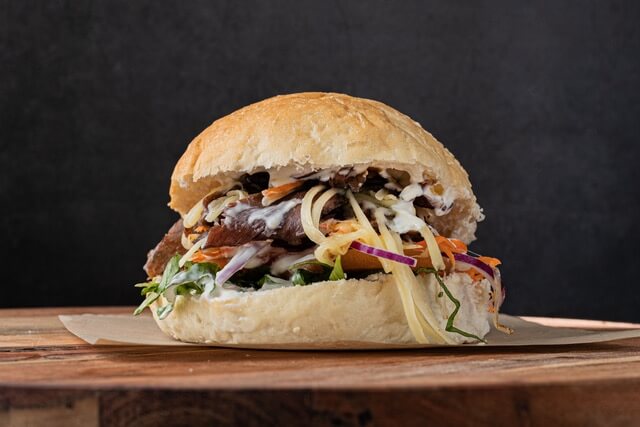 Marinated leg of lamb, thinly sliced with lettuce, tomato, red onion, carrot, cheese & then hit with garlic yoghurt
