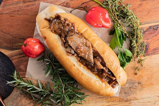 Marinated lamb cooked on rotisserie then covered in gravy served on a long roll