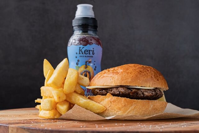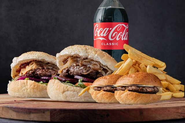 2 Plain burgers, 2 kids cheese burgers, medium chips and a 1.25L bottle of drink