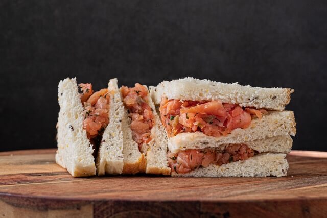 Smoked salmon with chopped dill and lemon juice, mixed leaves tomato beetroot cucumber carrot red onion cheese with your choice of bread & sauce